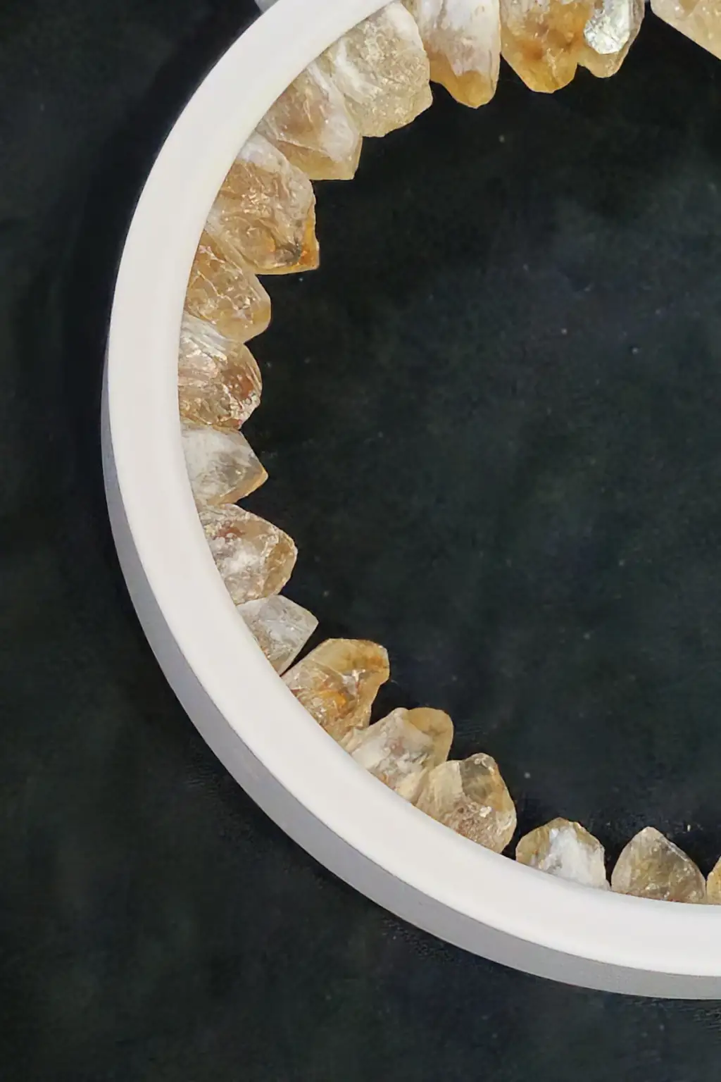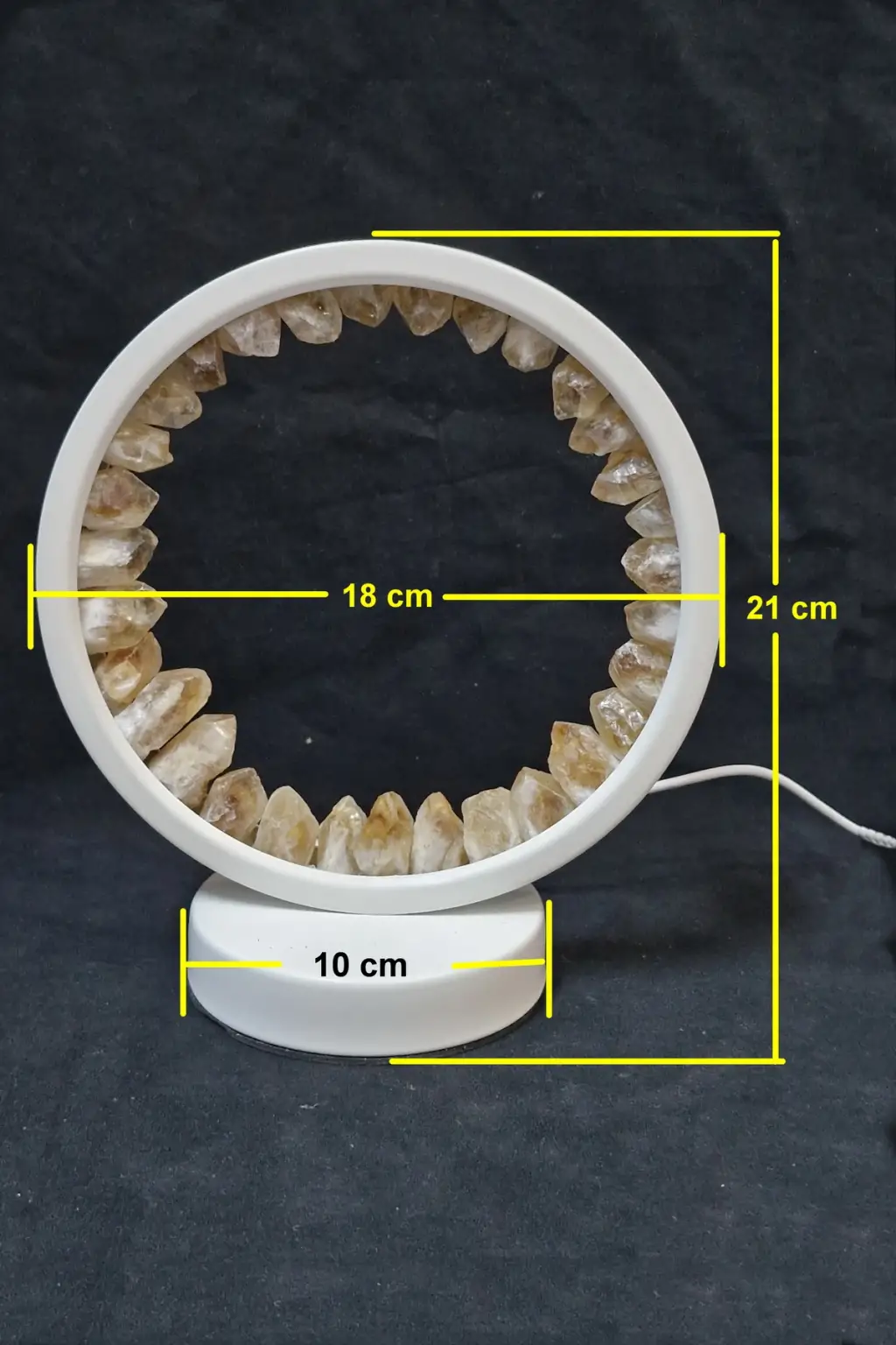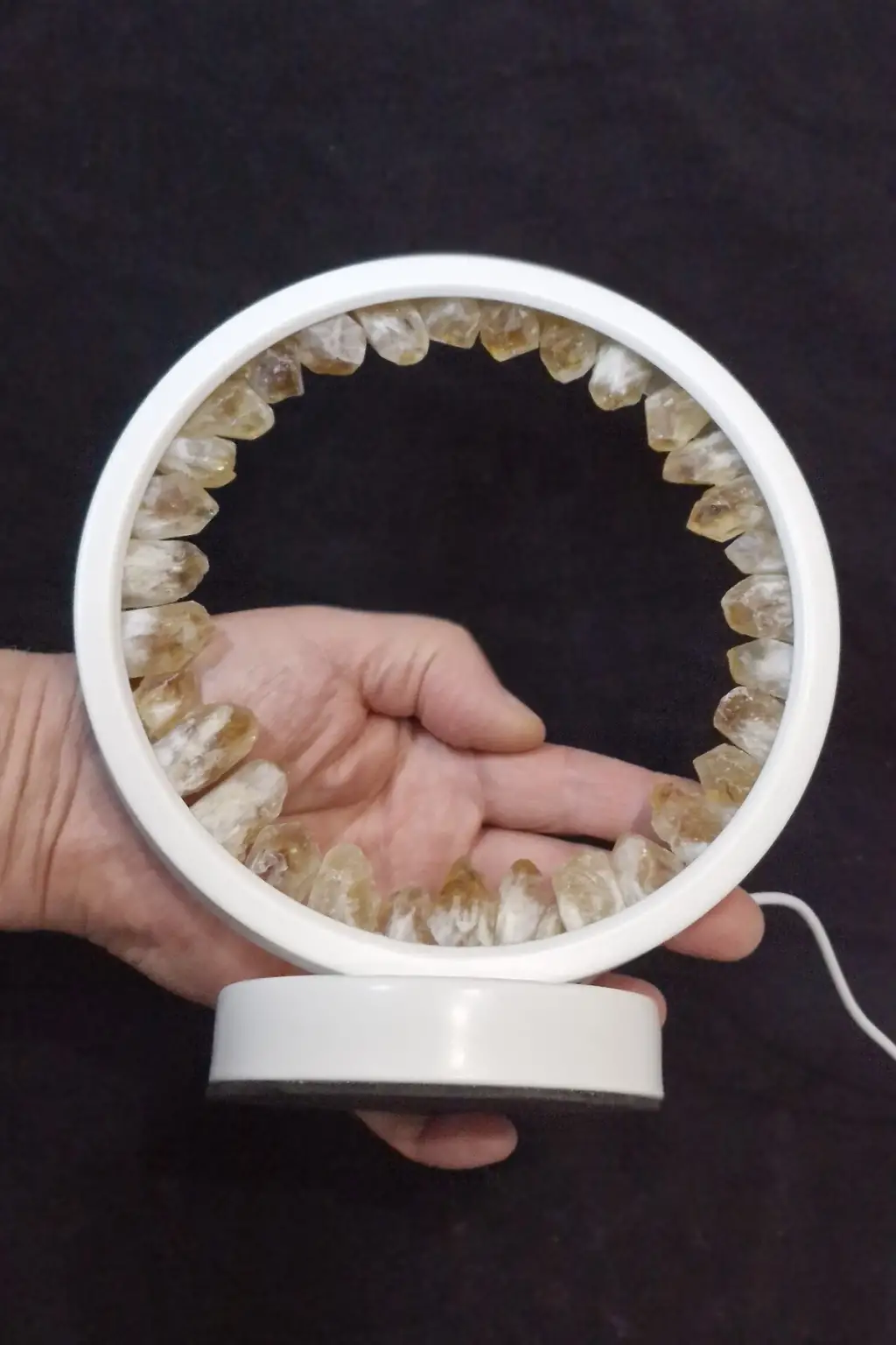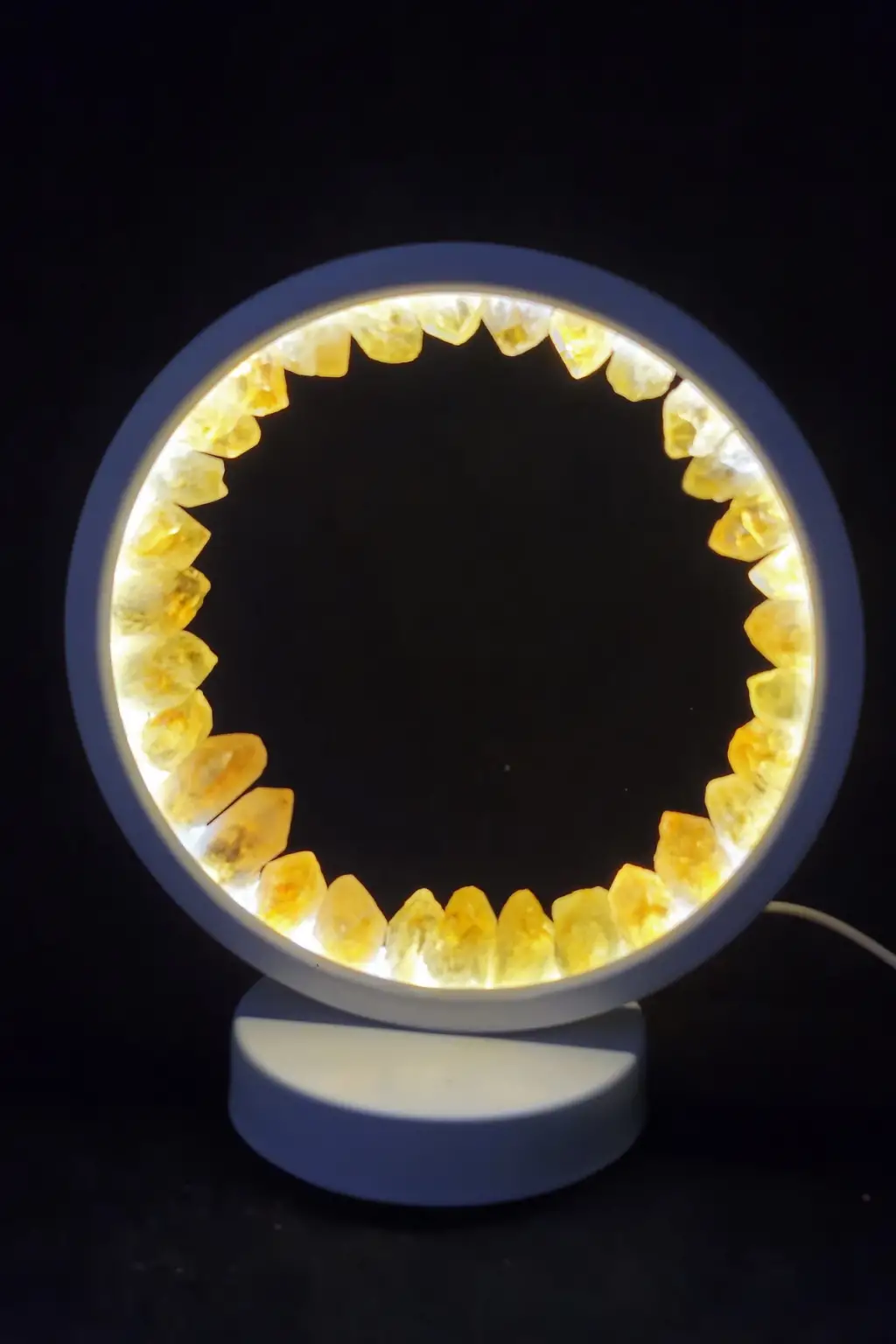 LED ışıklı yuvarlak panel üzerine yerleştirilmiş doğal sitrin uçlardan yapılmıştır.