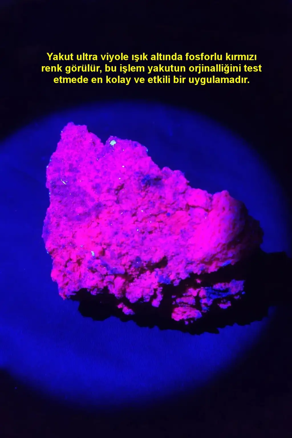 Yakut ultra viyole ışık altında fotoğrafta görüldüğü gibi fosforlu kırmızı renk görülür, bu işlem yakutun orjinalliğini test etmede en kolay ve etkili bir uygulamadır.