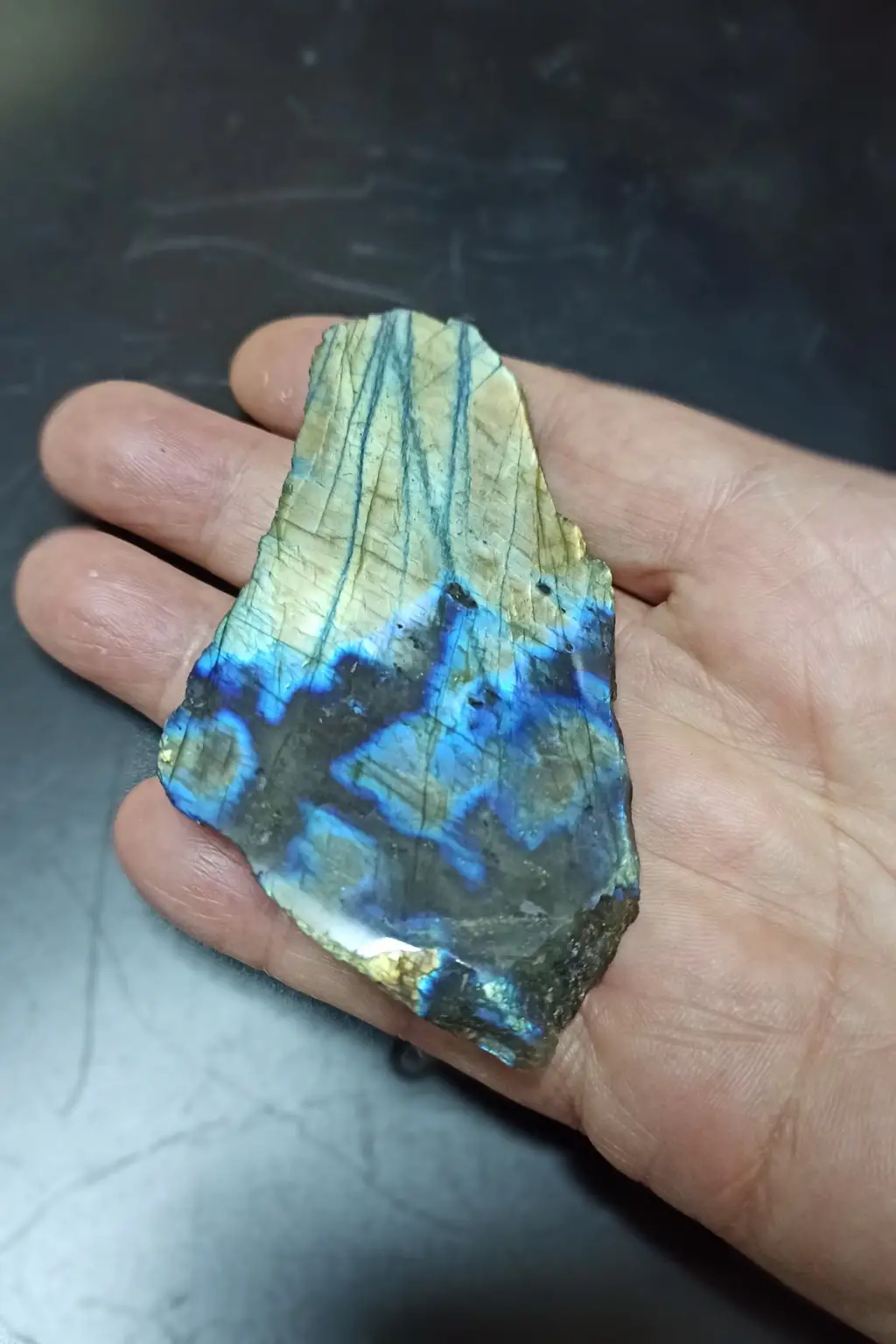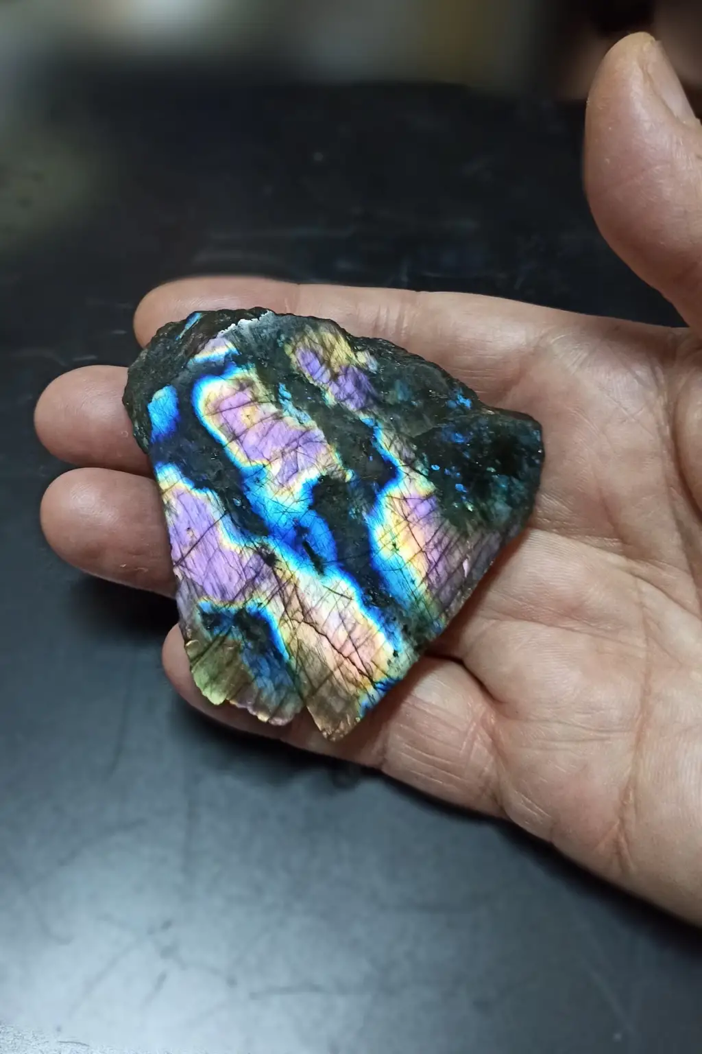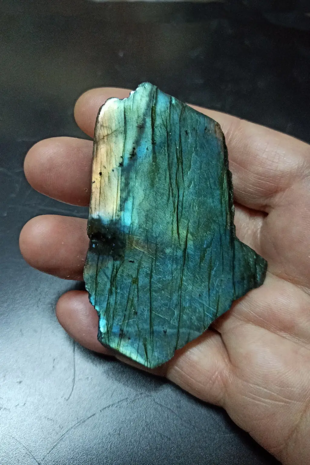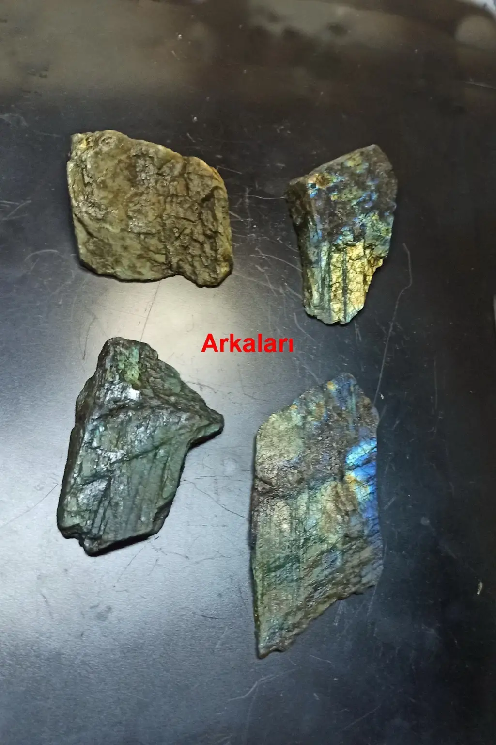 Labradorit taşının bir yüzeyi kesilerek parlatılmıştır. Arka tarafı işlem görmemiştir.