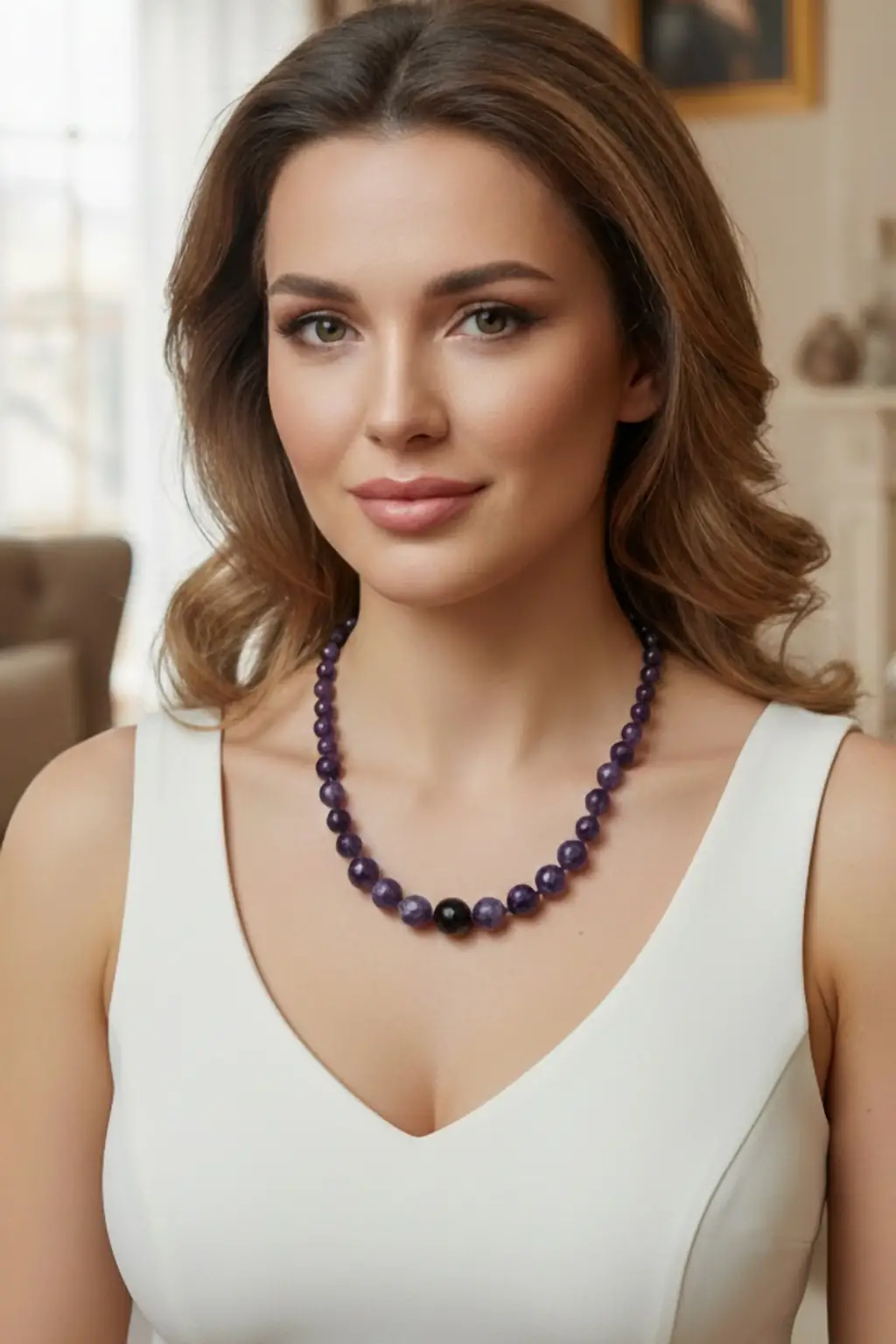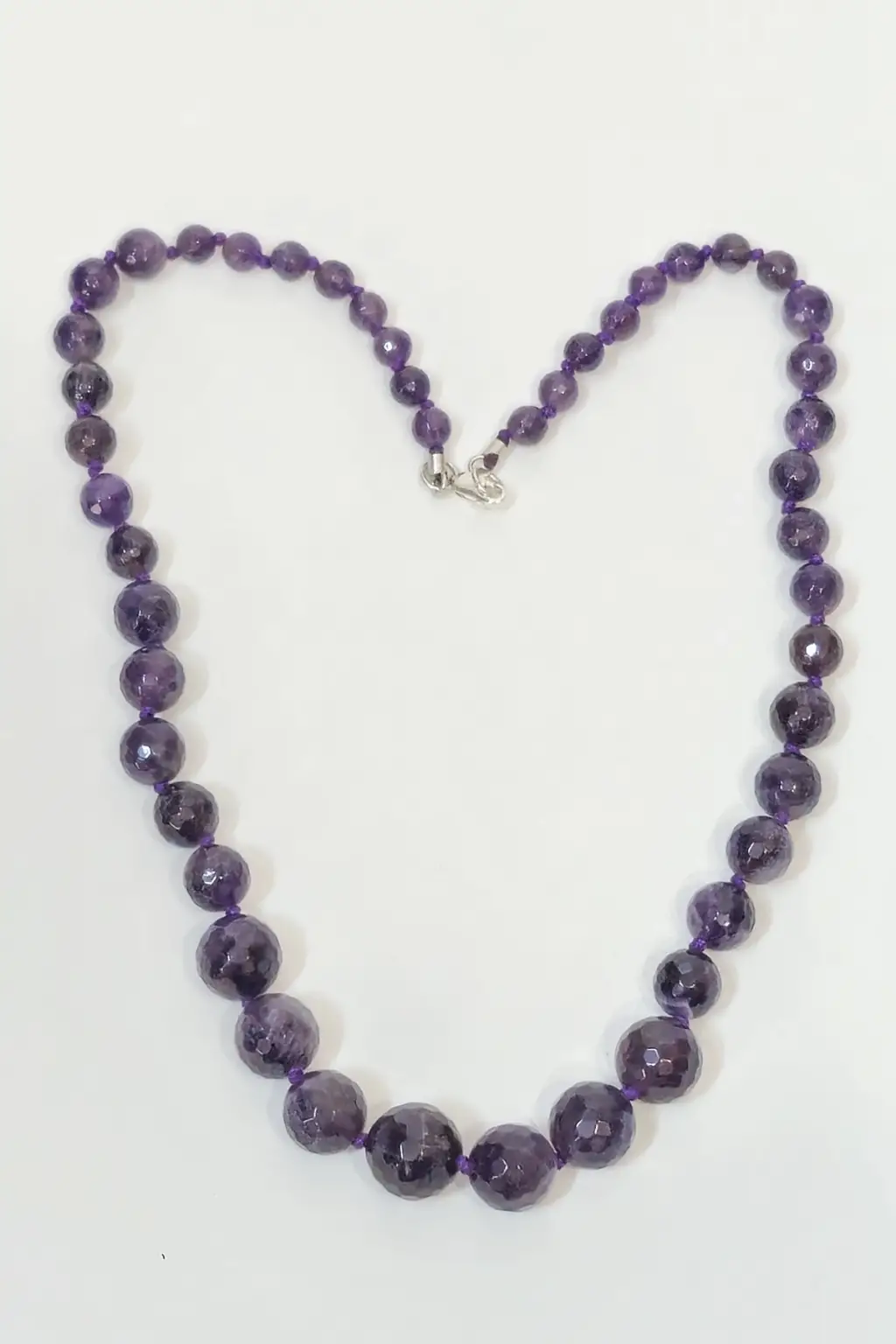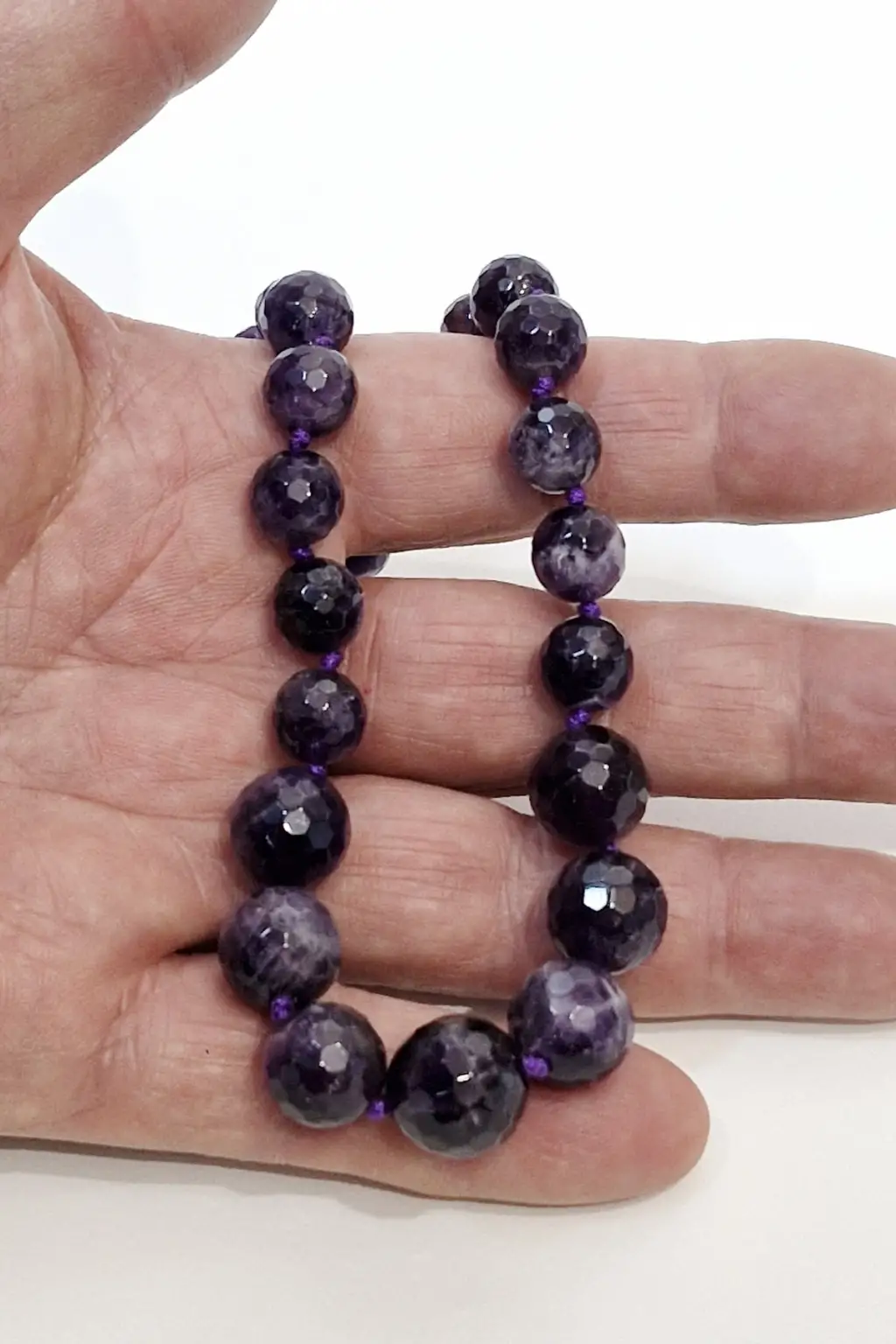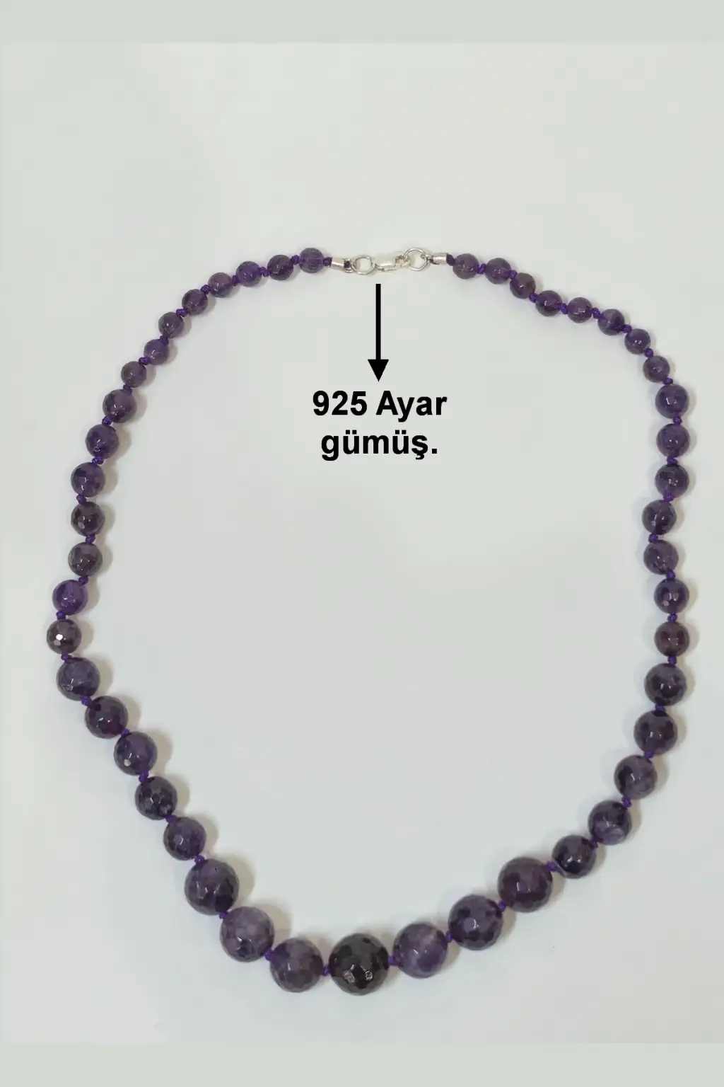 Faset kesimli, koyu renk doğal ametist taşlardan tasarlanmıştır.