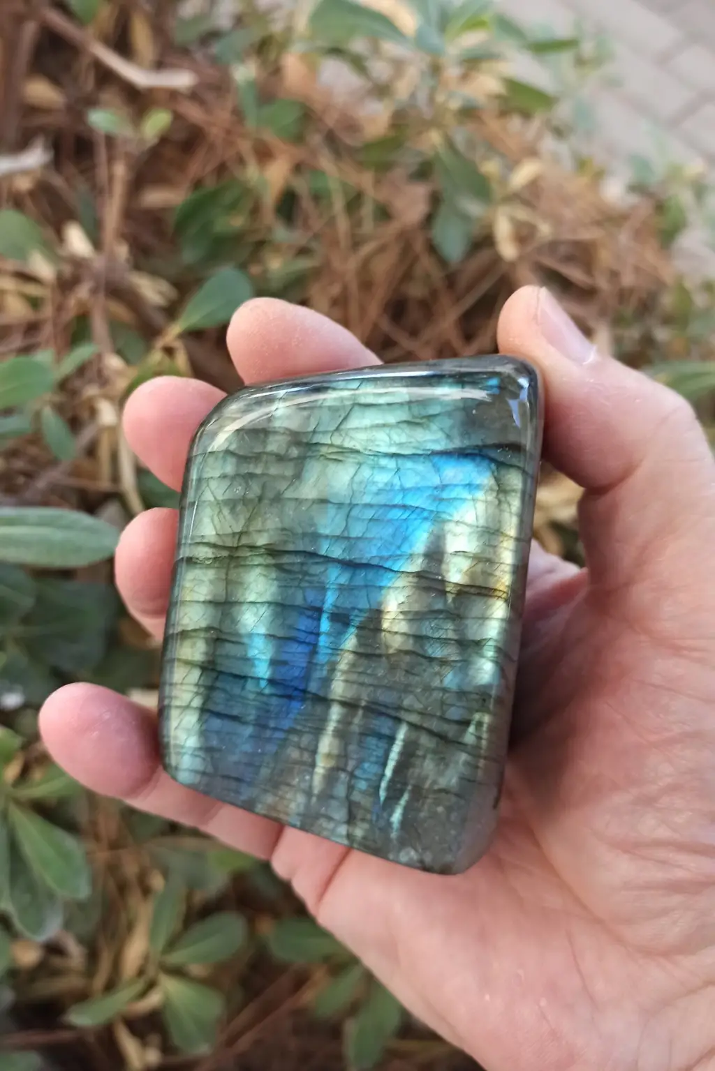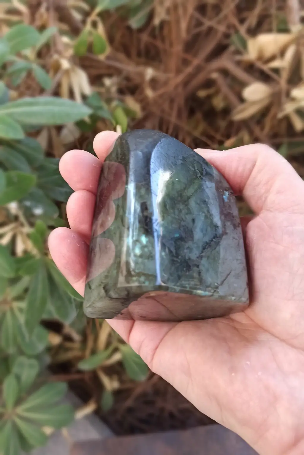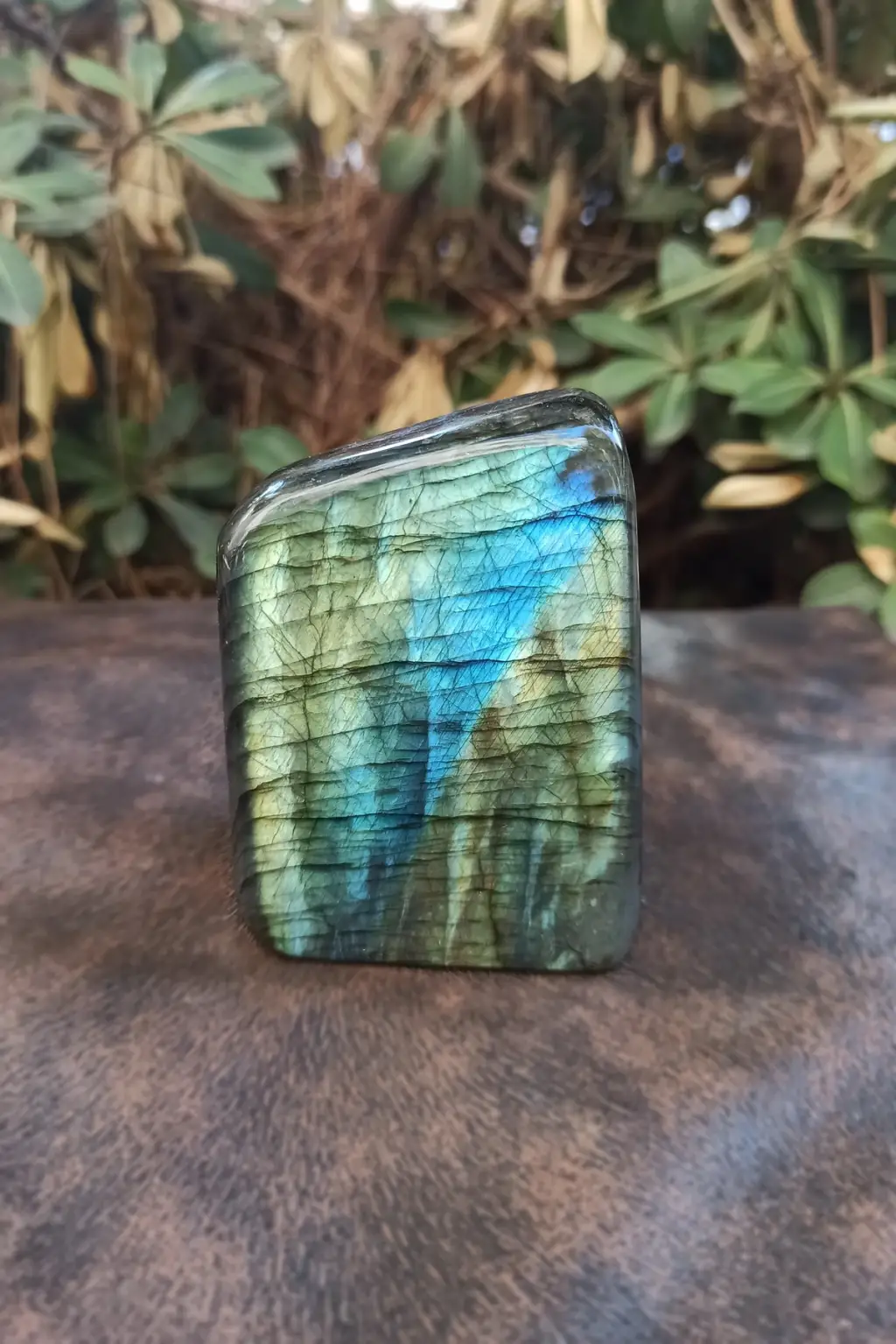 Aldığı ışığa göre yüzeyinden ışıltılar saçan doğal labradorit parça.