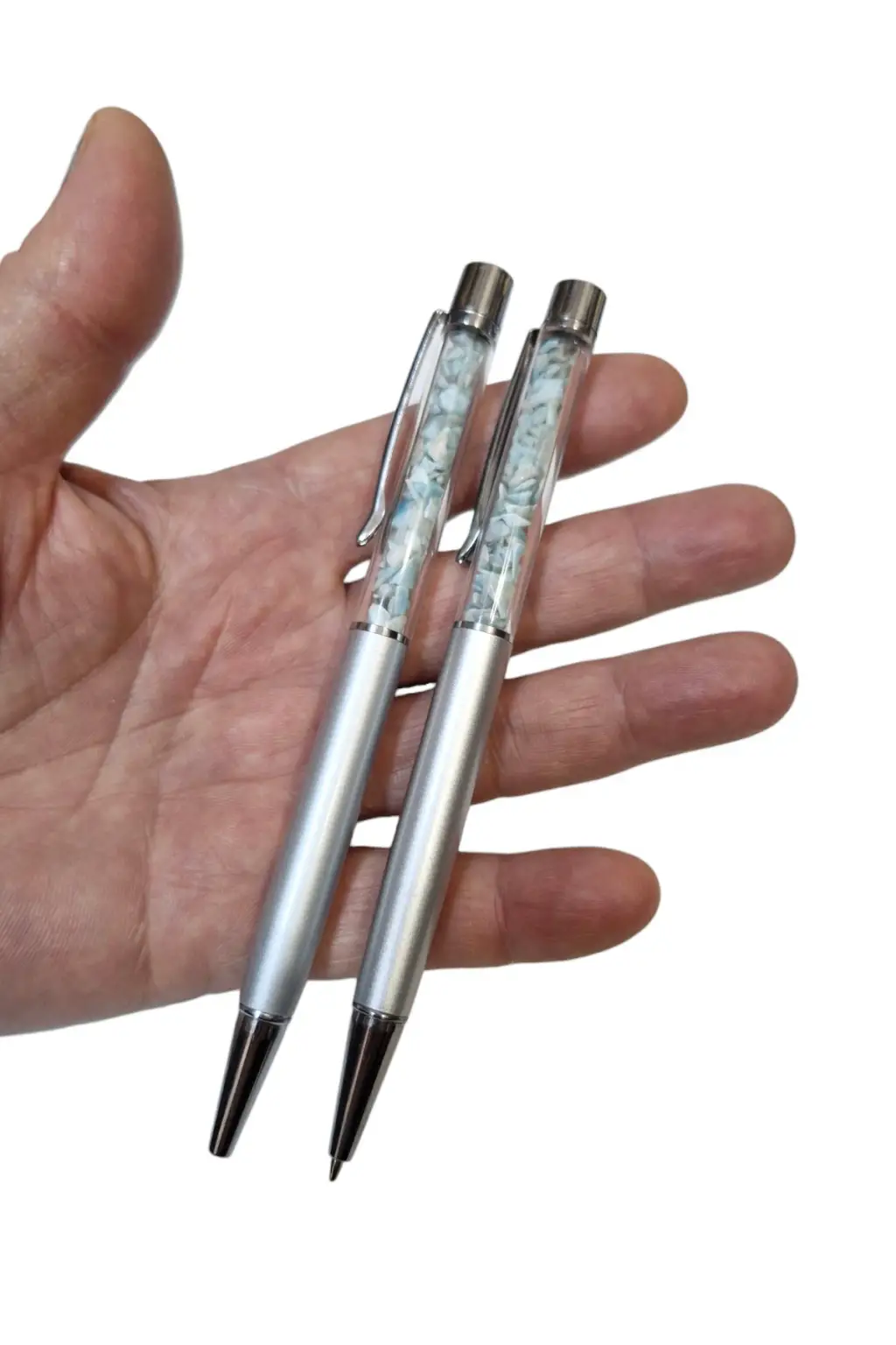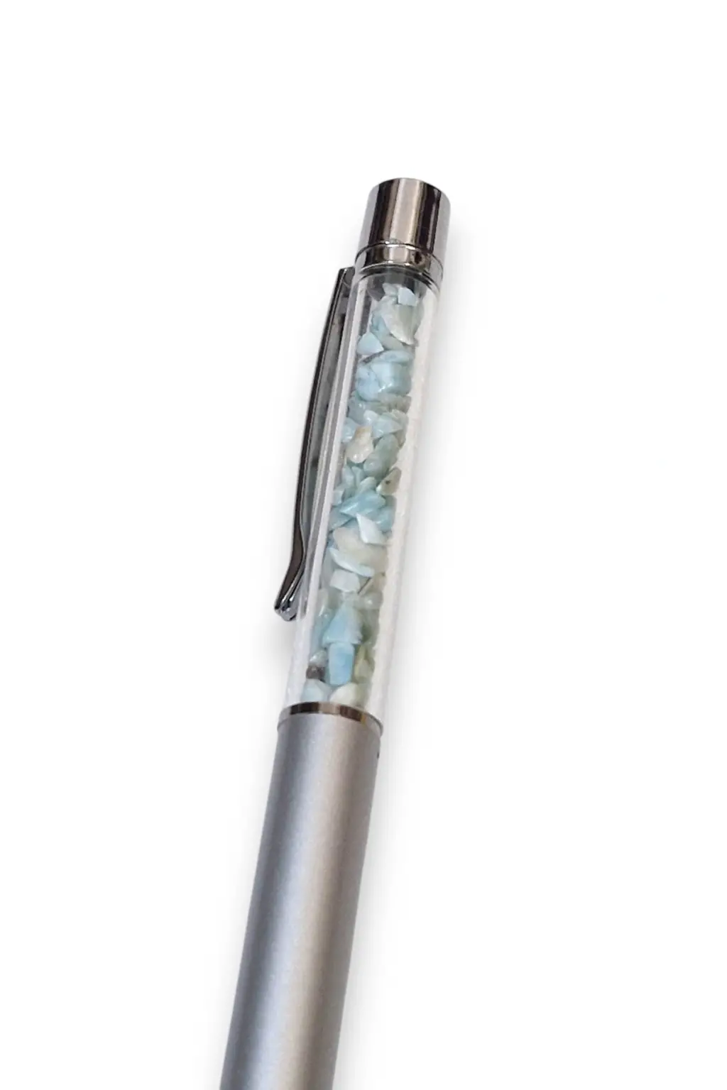 Kalemin şeffaf gövdesine, minik larimar taşlar konularak yapılmıştır.